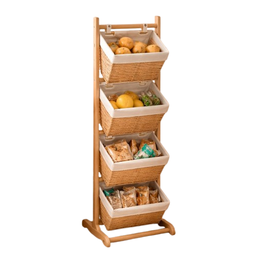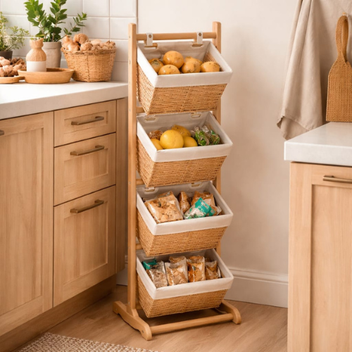 Organizador vertical de 3 niveles con canastas tipo rattan, ideal para optimizar espacios en habitación, baño o cocina. Su diseño práctico y decorativo permite mantener todo ordenado y al alcance, aportando un toque natural y elegante a cualquier ambiente.