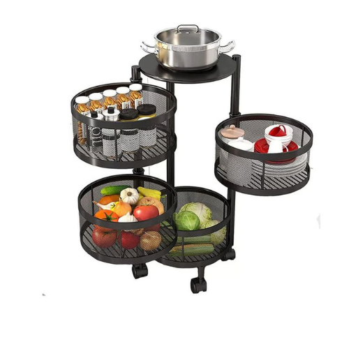 Estante organizador redondo de estructura metálica resistente. Cuenta con 4 canastas tipo malla, ideal para almacenar articulos de cocina o baño. Su diseño redondo redodndo optimiza el espacio y gracias a sus ruedas es facil de mover.