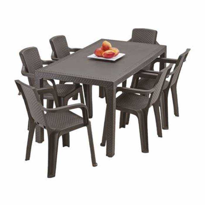 El combo Familiar Eterna con Mesa Rectangular de 80 x 150 cm y 70 Cm de altura; Comedor ideal con espacio para 6 puestos. Patas cuadradas , que brindan elegancia y una línea de diseño única. De apariencia Rattan y colores clásicos y elegantes; ideal para usos interiores o exteriores, práctica, fácil de limpiar y con todos los beneficios del plástico.
