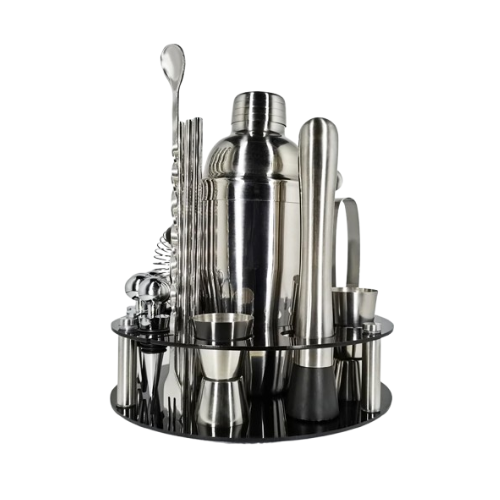 Incluye una coctelera, un medidor (jigger), un colador, una cuchara mezcladora y pinzas, un macerador, dos vertedor de botella, pitillos y cepillo de pitillo.