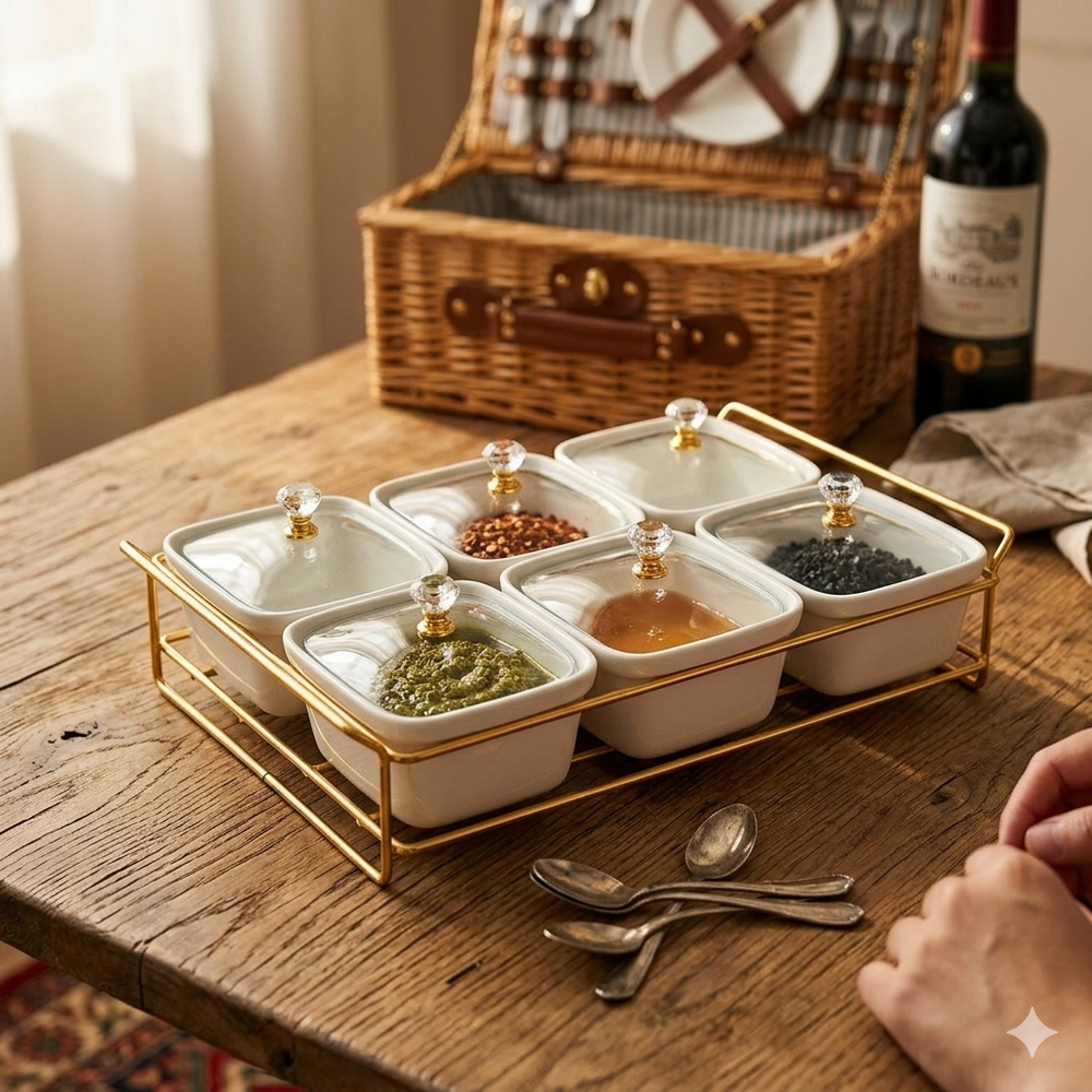 Soporte Minimalista: Incluye una base metálica en acabado dorado que mantiene todo organizado y facilita el servicio de la mesa.